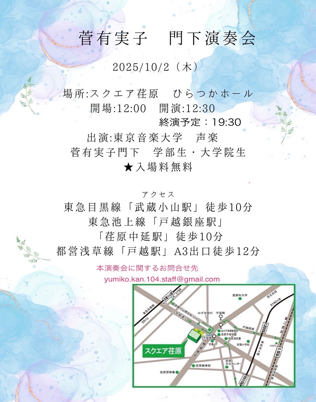 10月2日(木)に恒例の菅有実子門下演奏会を開催いたします。 平日の開催となりますが、お時間に都合がつく方、ぜひいらしてください。 入場無料、事前申込み不要です。 開催場所 スクエア荏原(えばら) ひらつかホール 開演時刻 12:30(開場12:00) 終演時刻 19:30(予定) 本演奏会に関するお問合せ先 yumiko.kan.104.staff@gmail.com 【2025.9.8掲載】 |