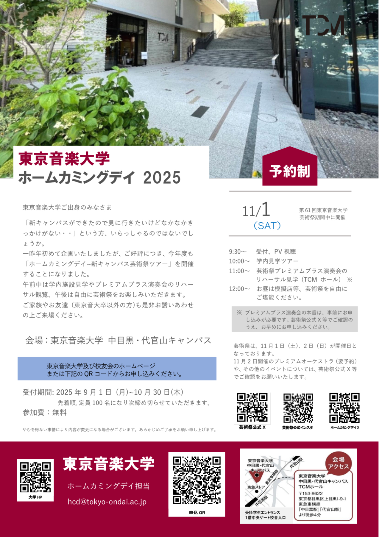 東京音大芸術祭が、11月1日(土)~2日(日)に中目黒・代官山キャンパスで開催されます。 芸術祭特設ページ https://www.tokyo-ondai.ac.jp/information/46199.php そして芸術祭初日には、卒業生の皆様に向けた「ホームカミングデイ」も開催されます。 新キャンパスツアーの企画もありますので、ご家族やお友達もお誘い合わせの上ご来場ください。 事前予約制で、申込期限は10月30日(木)です。 ホームカミングデイ特設ページ https://www.tokyo-ondai.ac.jp/information/46387.php (予定は変更になる可能性があります。必ず最新情報を東京音大ホームページでご確認ください) 【2025.10.10掲載】 |